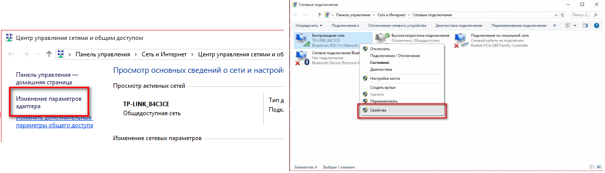 Нажмите правой кнопкой мыши на значок подключения к интернету, выберите «Центр управления сетями…», и «Изменение параметров адаптера».