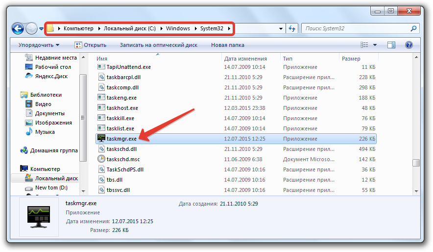 - За работу Диспетчера задач отвечает программа «taskmgr.exe», которая находится на системном диске в папке WINDOWS\ System32.