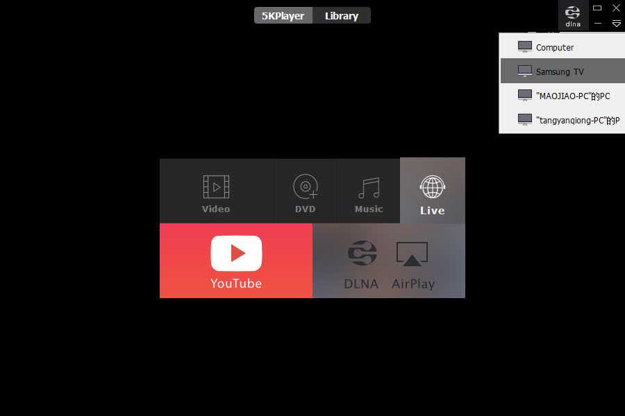 Step 1: Let’s assume you have successfully installed 5KPlayer for your Windows computer. It won’t require any more actions to directly stream video music from the DLNA server to a smart TV. You only need to click on the «DLNA» icon on the top-right corner of the software > choose the target DLNA receiver to start streaming video or music.