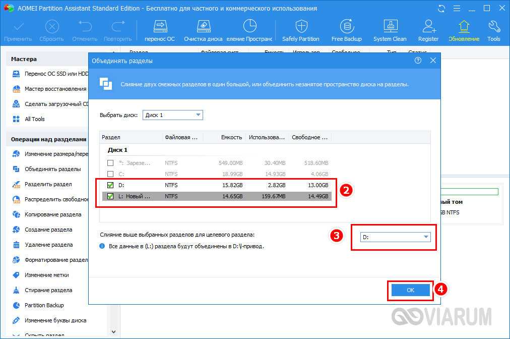 - Откроется мастер объединения. Из списка выберите тот раздел, который хотите приплюсовать к основному. После чего нажмите «ОК».