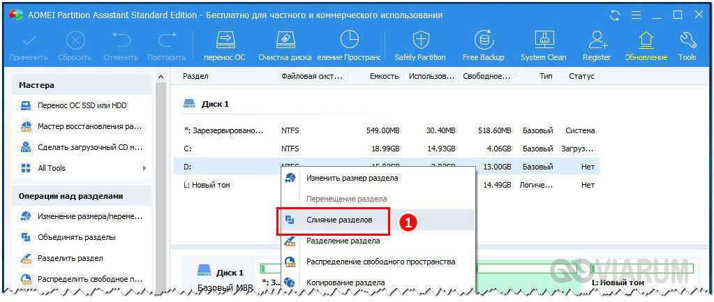 - Для этого кликните по «C» правой кнопкой мыши и в контекстном меню выберите «Слияние разделов».