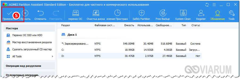 - Окошко «Merge Partition» закроется. В самом приложении нажмите по синей галочке «Apply», чтобы начать слияние.