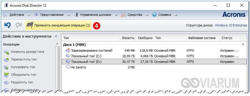 Нажмите «OK» и примените запланированные операции. Для их выполнения может потребоваться перезагрузка компьютера. В процессе слияния файлы с томов будут перемещены в отдельную папку на основном разделе автоматически.