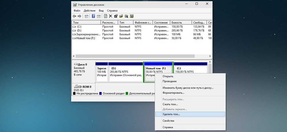 Теперь нам нужно выбрать раздел, который мы собираемся присоединить к другому разделу. В моём случае это раздел F. Нажимаем на нём правой клавишей мыши и выбираем пункт «Удалить том».