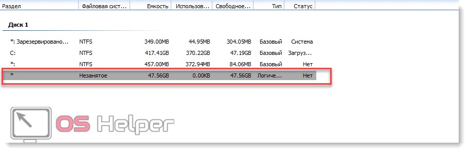 Появление 50 ГБ с надписью «Не распределена» говорит нам о том, что теперь мы можем это свободное и нераспределённое пространство прибавить к любому другому разделу нашего жёсткого диска.