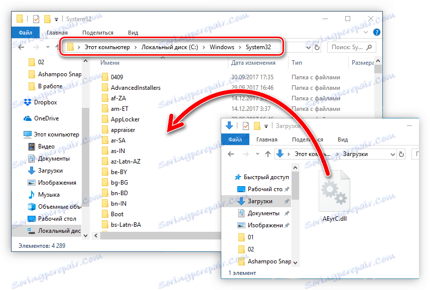 Крім усього іншого, є можливість усунути помилку, не вдаючись до кардинальних заходів, таким як перевстановлення. Ви можете завантажити безпосередньо саму бібліотеку AEyrC.dll і помістити її в системну директорію. Зробити це найпростіше звичайним переміщенням файлу з однієї директорії в іншу, як це зображено нижче.