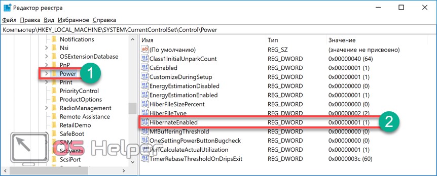 - Последовательно открываем «ветви» реестра, следуя по пути: HKLM\SYSTEM\CurrentControlSet\Control. Ищем подраздел Power и, нажав на него, открываем содержимое в правой половине окна. Интересующий нас параметр именуется HibernateEnabled. В данный момент он имеет значение переменной REG_DWORD равное «1». Это означает, что гибернация в системе включена.