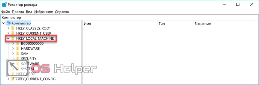 - Открывается редактор реестра. В левой части расположены «кусты», содержащие информацию. Нас интересует HKEY_LOCAL_MACHINE. Все данные о компьютере и его конфигурации собраны в нем.