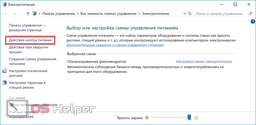 Далее в левой части экрана необходимо выбрать вкладку «Действия кнопок питания»;