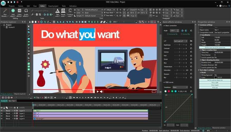 Все базовые инструменты монтажа находятся в меню быстрого доступа сверху: это обрезка и разбивка кадра, поворот, кадрирование и уровень прозрачности. Советуем начать работу в программе именно с них, а затем переходить к эффектам и приёмам более продвинутого уровня. Например, помимо стандартного набора цветовых фильтров, переходов, видео и аудиоэффектов, VSDC позволяет сделать профессиональную цветокоррекцию, удалить фон на видео с помощью Хромакей, и поэкспериментировать с режимами наложения. В результате, с VSDC вы сможете как улучшить качество отснятого материала, так и смонтировать ролик со спецэффектами.