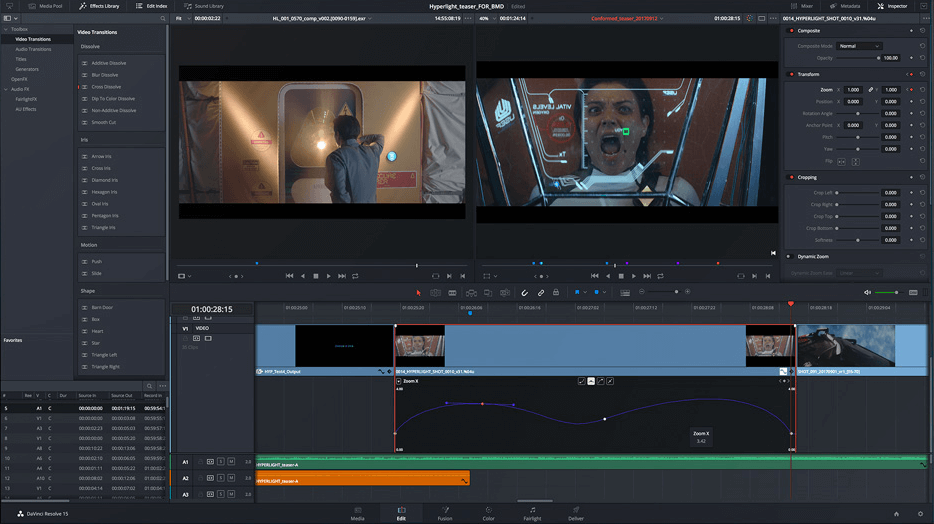Davinci Resolve — профессиональный видеоредактор от Black Magic Design. Является бесплатной версией инструмента Davinci Resolve Studio, используемого в Голливуде для создания спецэффектов. Эта программа должна вас заинтересовать, если вам нужно монтировать видео на профессиональном уровне. Вы получаете в распоряжение временную шкалу, расширенное управление мультимедиа, плагины и многие другие функции.