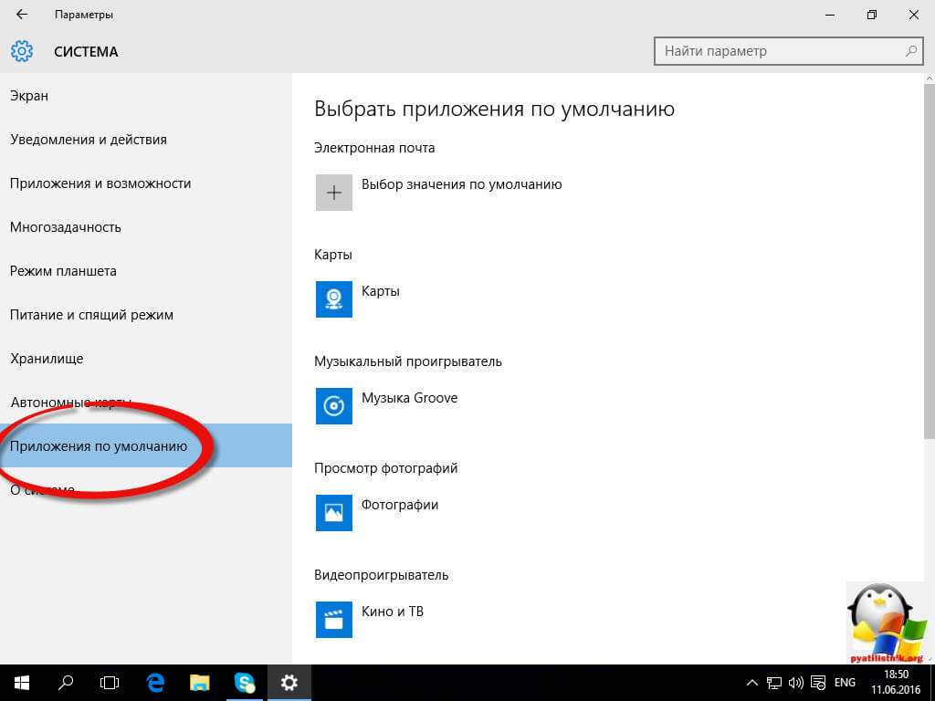 В пункте система переходите на вкладку Приложения по умолчанию, именно оно отвечает за сопоставление ассоциации файлов с программами на вашем компьютере. В правой части вам нужно промотать ползунок до самого низу.