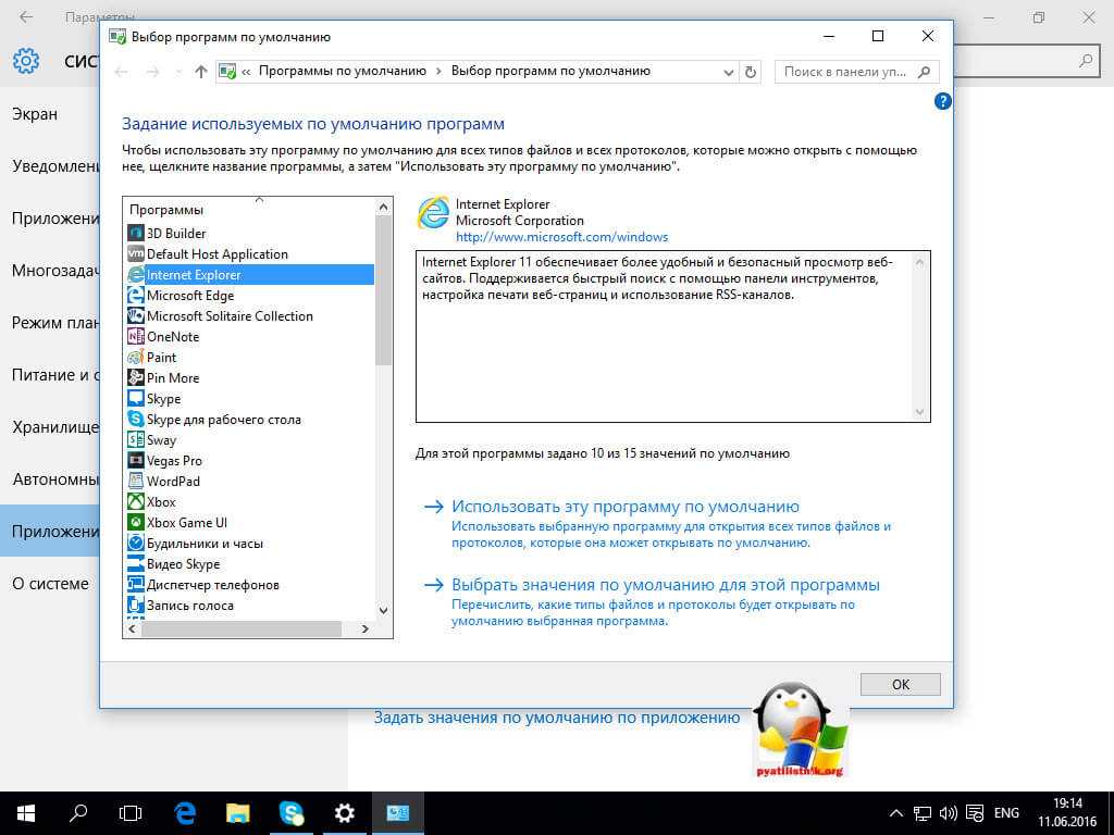 Или могу сказать, что по умолчанию будет Edge, но вот формат https будет открываться Internet Explore, делается это в пункте Выбрать значения по умолчанию для этой программы.