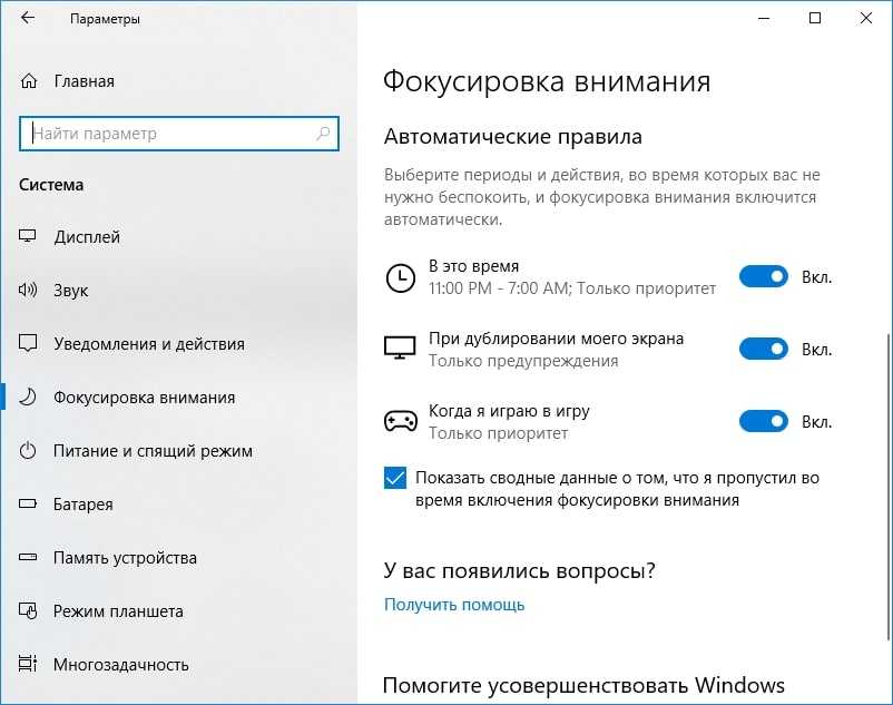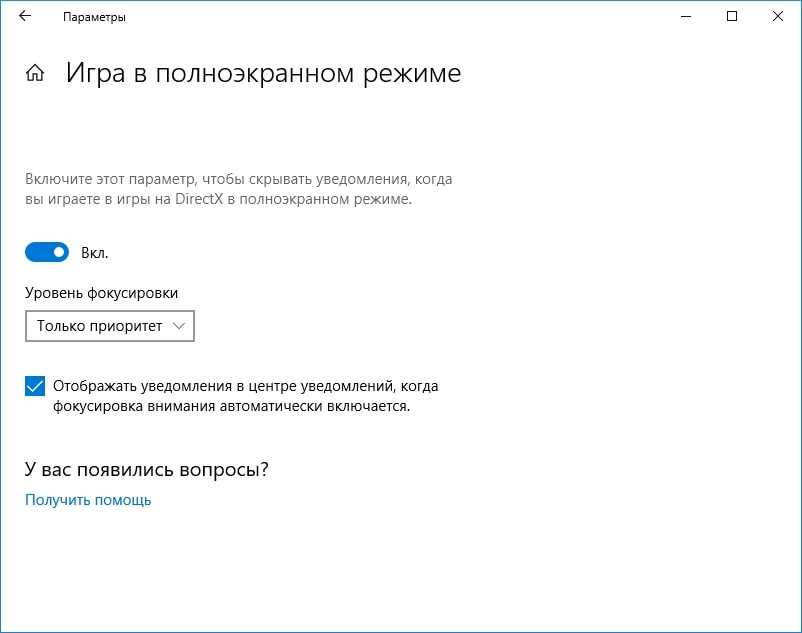 - «Когда я играю в игру» – правило обеспечит вам полное погружение в игровой процесс без помех в виде ненужных в данное время сообщений со стороны системы, позволяя задать и уровень фокусировки. Имеются в виду DirectX-игры в полноэкранном режиме.