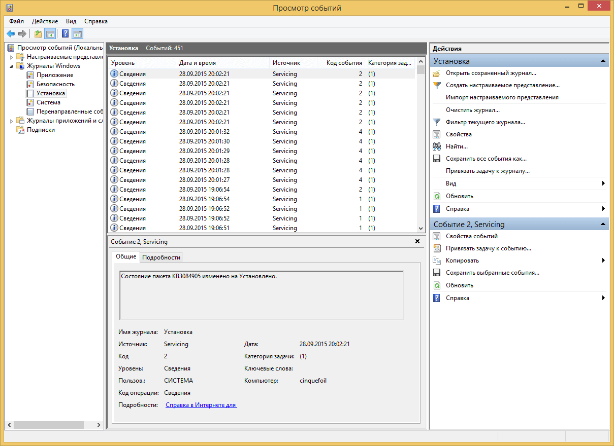 - Сведения (информационные события) — информация о важных системных событиях, например, об установке обновлений. К примеру, если в один из дней внезапно начались сбои Windows, стоит приглядеться, что есть в информационных событиях в этот и предыдущий день.