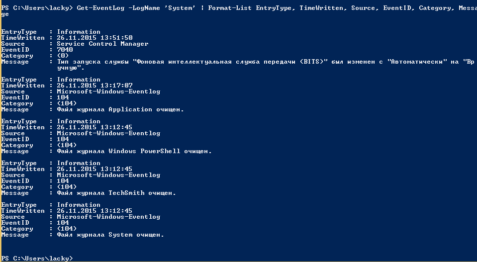 Например, для того чтобы в командной оболочке вывести события только со столбцами «Уровень», «Дата записи события», «Источник», «Код события», «Категория» и «Сообщение события» для журнала «Система», выполним команду: