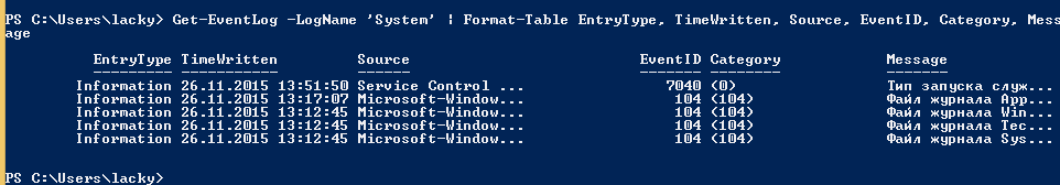 Get-EventLog –LogName ‘System’ | Format-Table EntryType, TimeWritten, Source, EventID, Category, Message