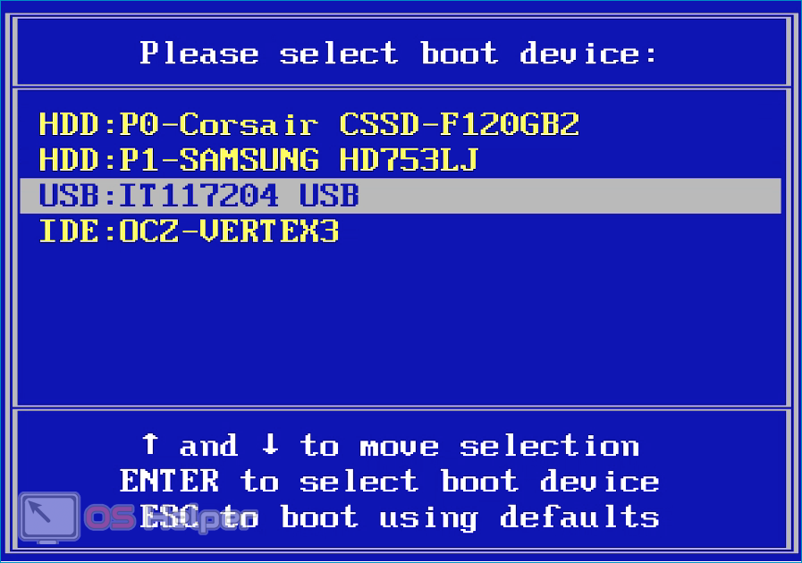 - Для этого нам нужно установить накопитель с загруженной Windows 10 в USB-порт компьютера и запустить машину с него. Для этого можно воспользоваться загрузочным меню либо переназначением очередности загрузки устройств в BIOS.