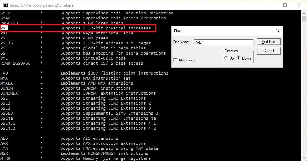 Вы увидите на экране большое количество различной информации. При помощи сочетания клавиш Ctrl + F (поиск на странице) убедитесь, что в списке присутствуют такие компоненты, как PAE, NX, SSE2 и CX16. Если каждый из них есть, Вы можете смело начинать обновляться до 64-разрядной версии Windows 10.