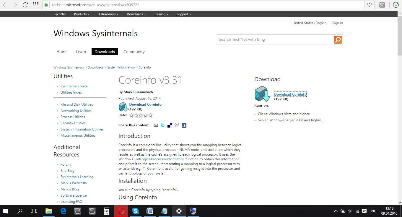 Вам необходимо зайти на сайт Майкрософта, перейти в и скачать себе Coreinfo