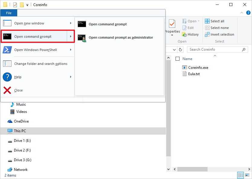 Когда откроется папка Coreinfo, жмем на Файл и выбираем Открыть командную строку