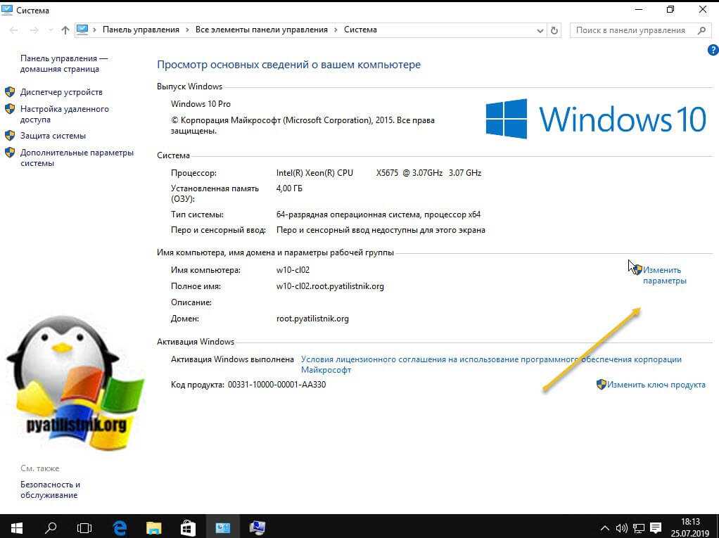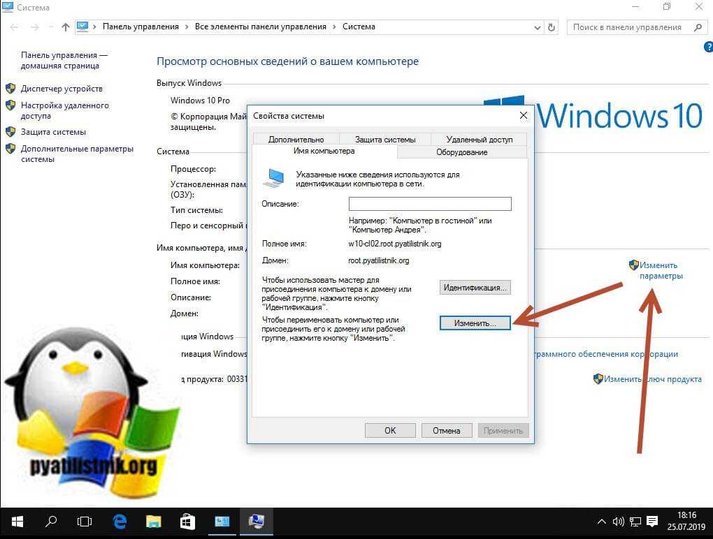 Изменение имени в свойствах системы