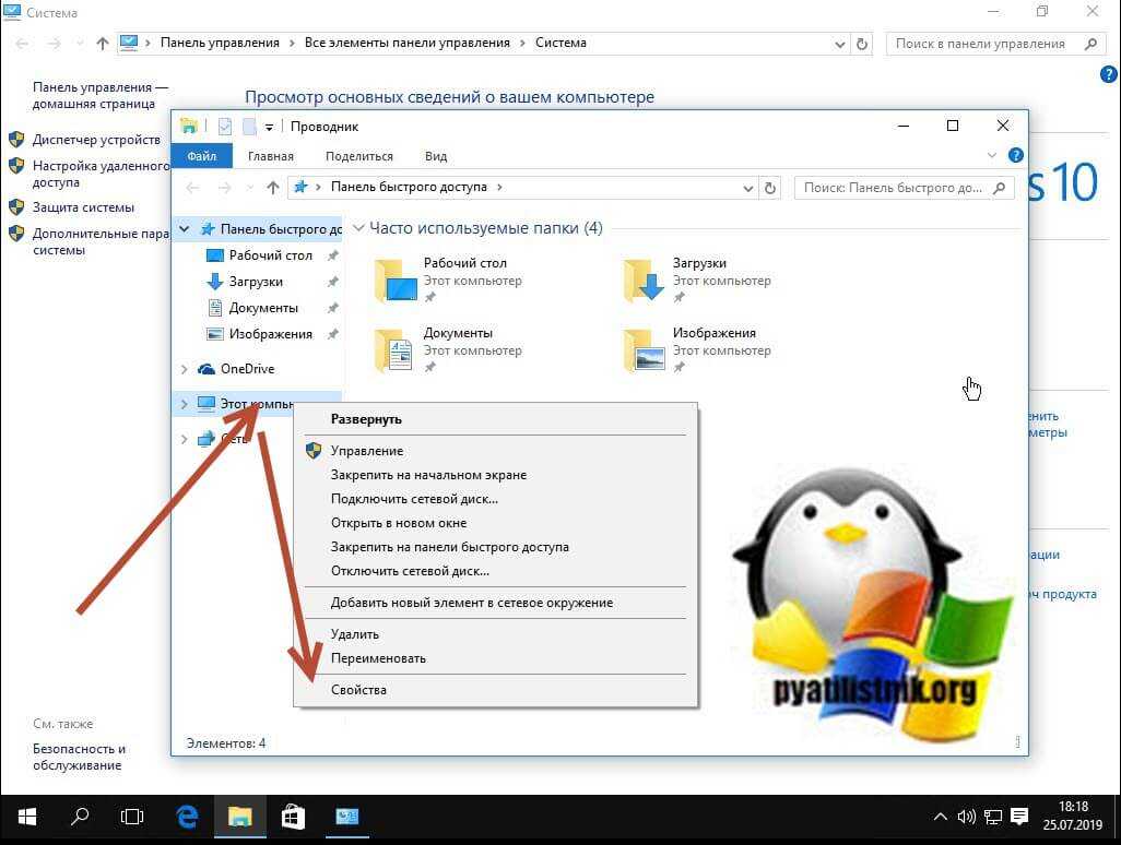 Еще одним метод открыть окошко свойств системы, это щелкнуть по значку «Этот компьютер» правым кликом и выбрать из контекстного меню пункт «Свойства».