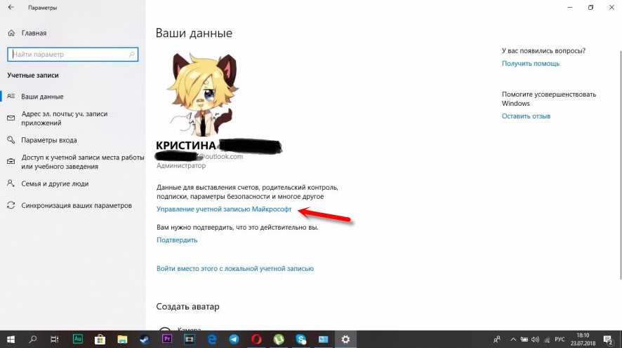Изменять имя учетной записи Microsoft нужно из меню «Учетные записи» параметров системы (то же меню, в которое вы заходили для проверки типа своего аккаунта). В пункте «Ваши данные» этого меню есть ссылка «Управление учетной записью Microsoft». По ней и нужно перейти.