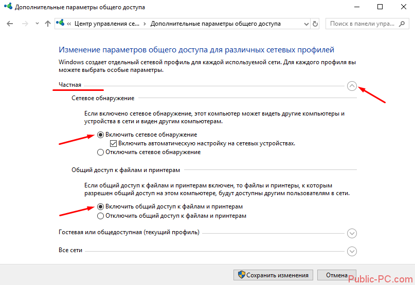 Здесь нам нужно установить маркер сетевого профиля напротив «Частные». Тем самым мы разрешим обнаруживать наш ПК по сети.