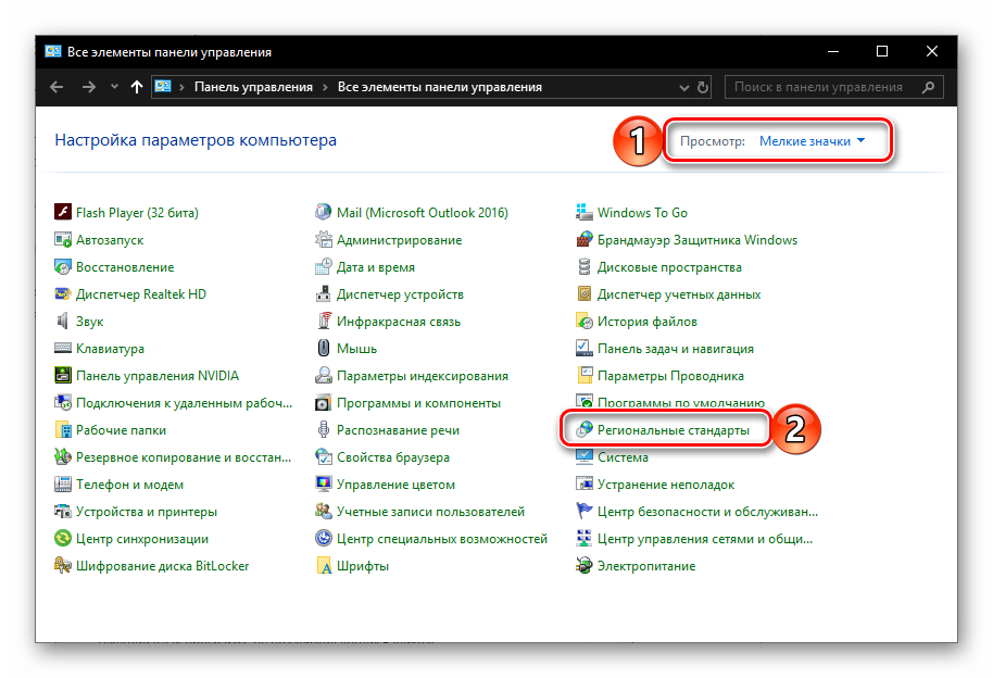 Активировав режим просмотра «Мелкие значки», перейдите к разделу «Региональные стандарты».