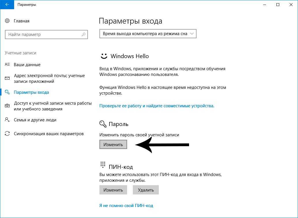 Переходите на вкладку «Параметры входа» и в разделе «Пароль» жмите на кнопку «Изменить».