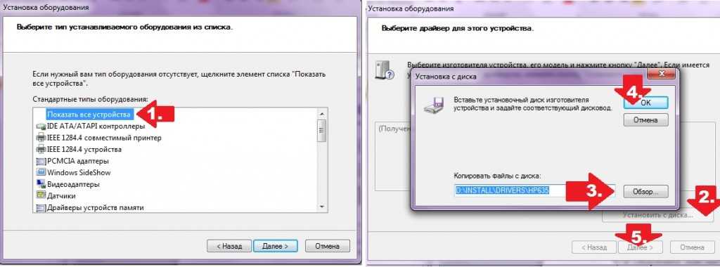 В новом окошке дважды кликаем пункт «Показать все устройства», а затем выбираем вариант «Установить с диска». После этого остается лишь найти и указать путь к драйверам, нажать кнопку OK и перейти к последнему шагу с помощью кнопки «Далее»: