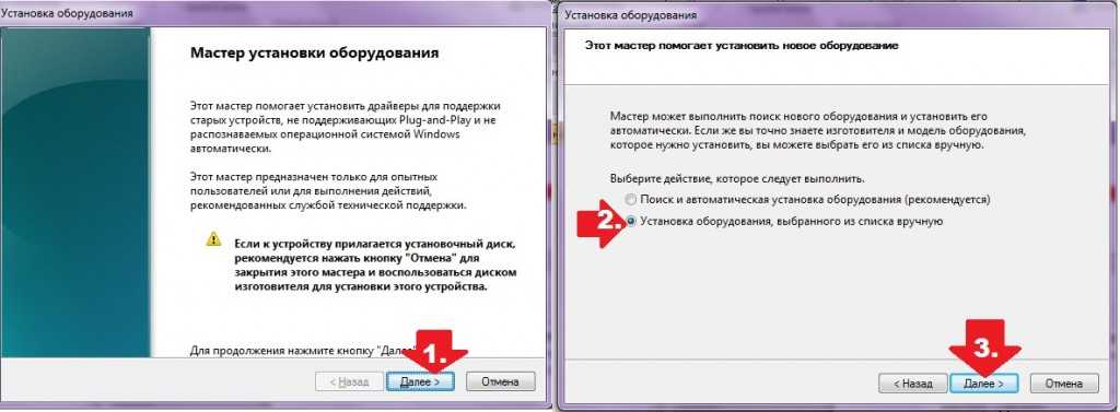 Отправляем в привод диск с установочными драйверами, нажимаем +R и выполняем через утилиту команду hdwwiz. После этого в открывшемся окошке нажимаем «Далее», выбираем вариант установки «…из списка вручную» и переходим к следующему шагу, используя кнопку «Далее»: