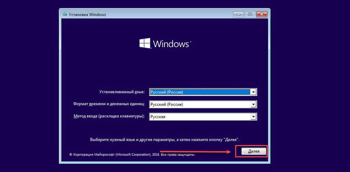 - В окне «Установка Windows» нажмите на кнопку «Далее».