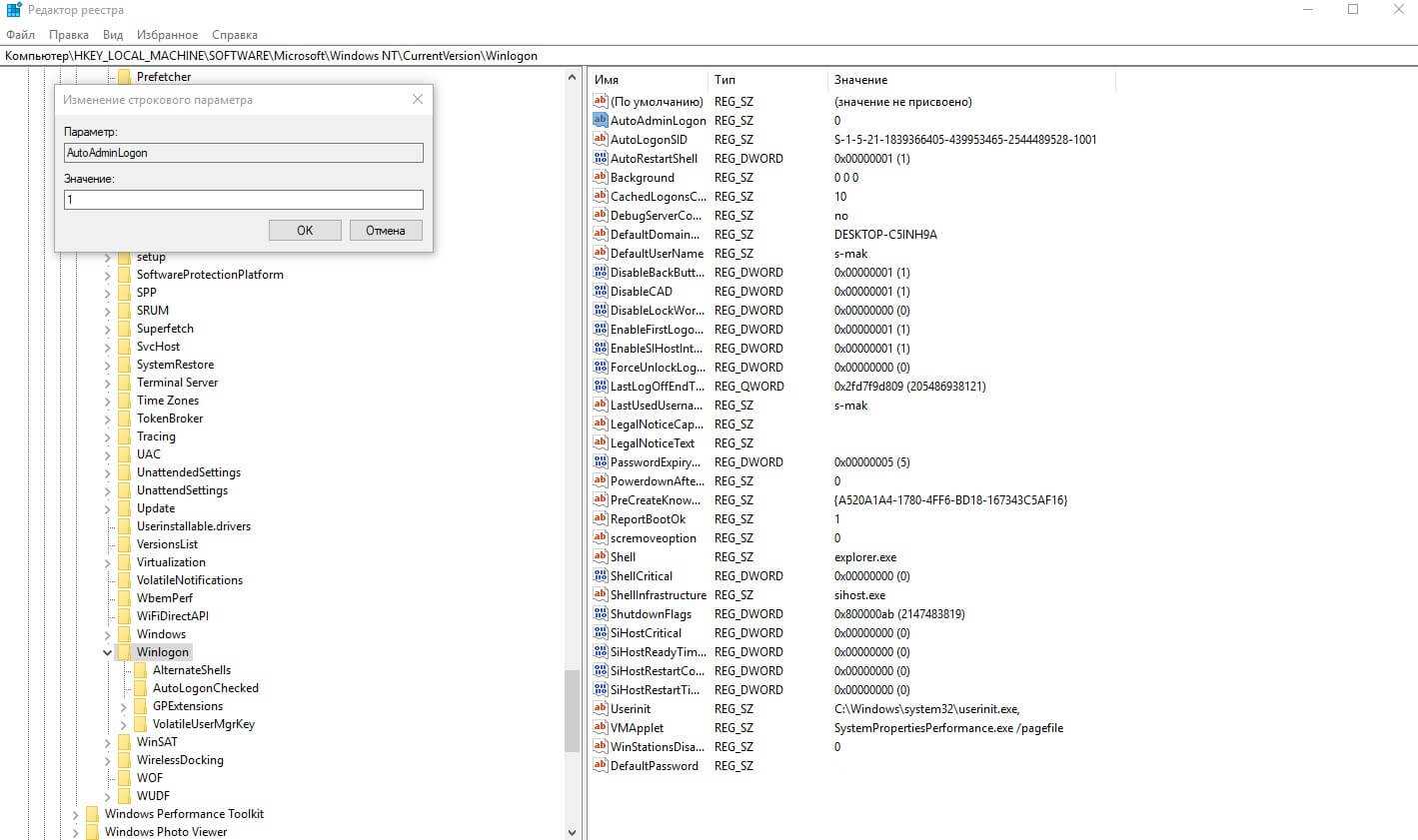 В строке «AutoAdminLogon» измените значение строкового параметра с 0 на 1, разрешив автоматический вход в операционную систему, сохраните и перезагрузите десктоп.