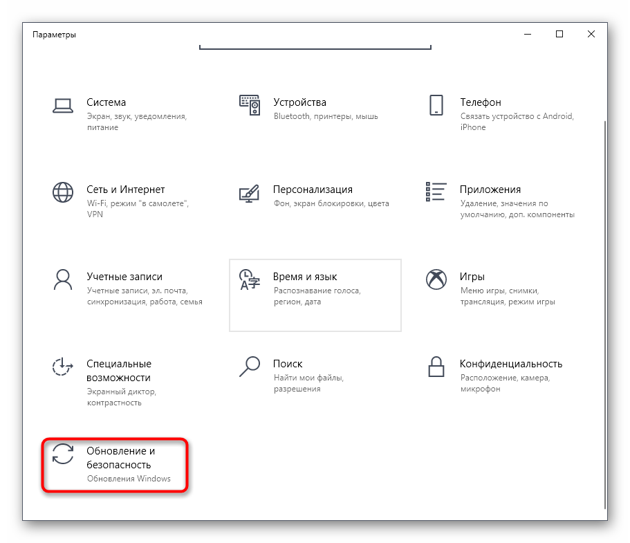 - Через меню «Параметры» перейдите в «Обновление и безопасность».