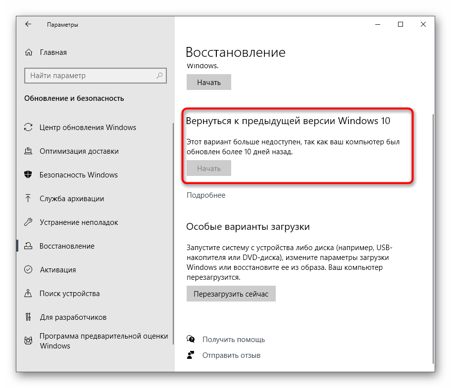 Отыщите пункт «Вернуться к предыдущей версии Windows 10» и нажмите на «Начать».