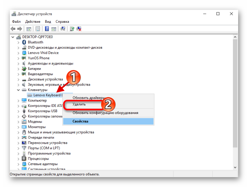 Обратите внимание: В редких случаях кнопка «Отключить» при нажатии правой кнопкой мыши на клавиатуру неактивна. В такой ситуации, чтобы отключить манипулятор, его потребуется удалить