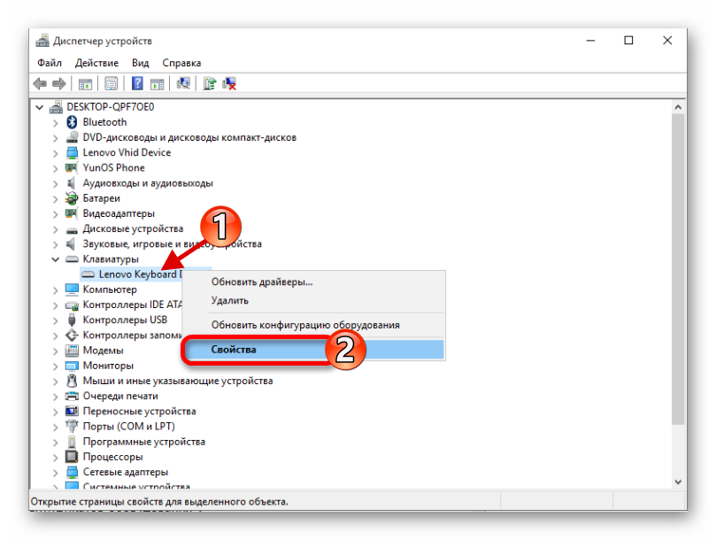 Откройте вкладку «Клавиатуры» и нажмите по устройству правой кнопкой мыши, выбрав «Свойства».