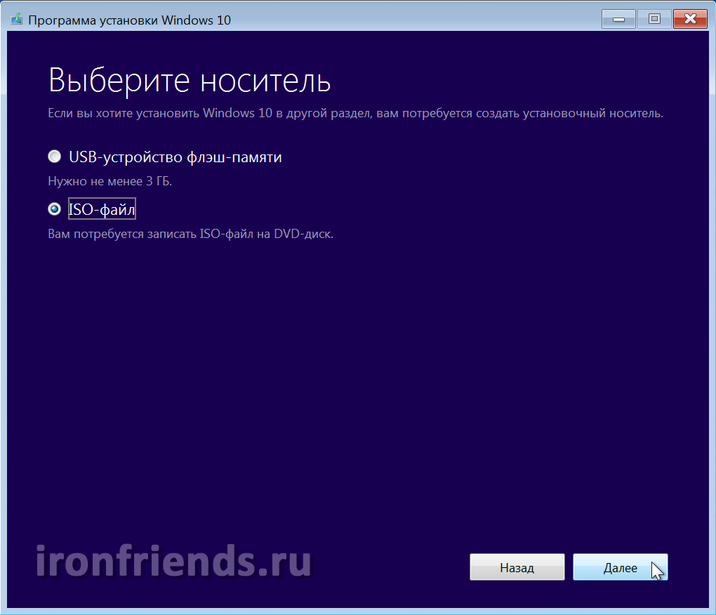 Пункт «Обновить этот компьютер сейчас» предназначен для обновления уже установленной у вас операционной системы Windows 7 или Windows 8.1. Но всегда лучше производить чистую установку с диска или флешки. Для этого нужно выбрать пункт «Создать установочный носитель для другого компьютера».