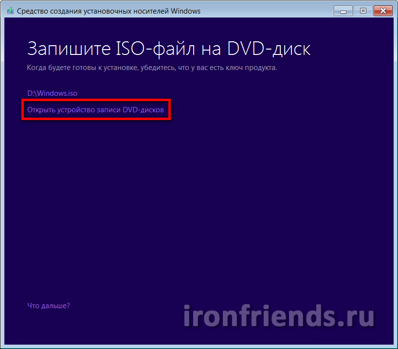 Следом у вас откроется интегрированная в Win10 служба записи образов. По умолчанию запись будет проводиться на накопитель в вашем дисководе. Нажмите «Далее» для начала переноса.