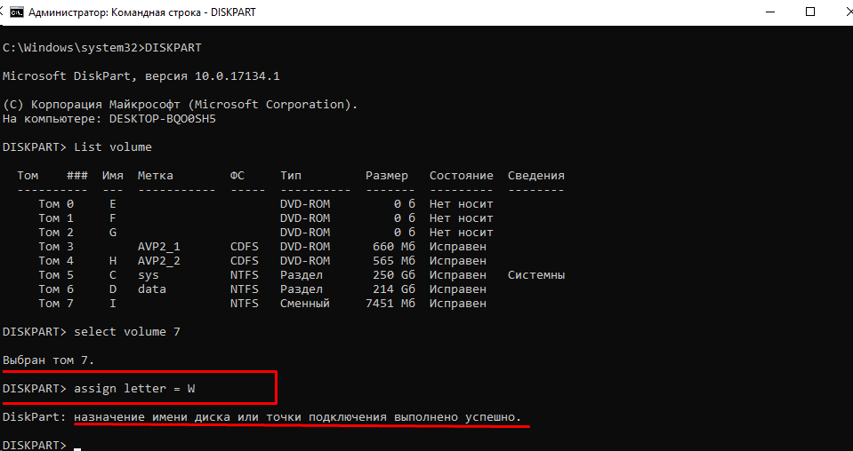 Теперь с этим томом можно проводить самые разные операции — от форматирования до удаления. Но нам нужно изменить букву тома. Для этого есть команда assign letter. Я меняю букву диска с I на W. Перед сменой убеждаюсь, что выбранная буква еще не занята и вводим команду как на рисунке: