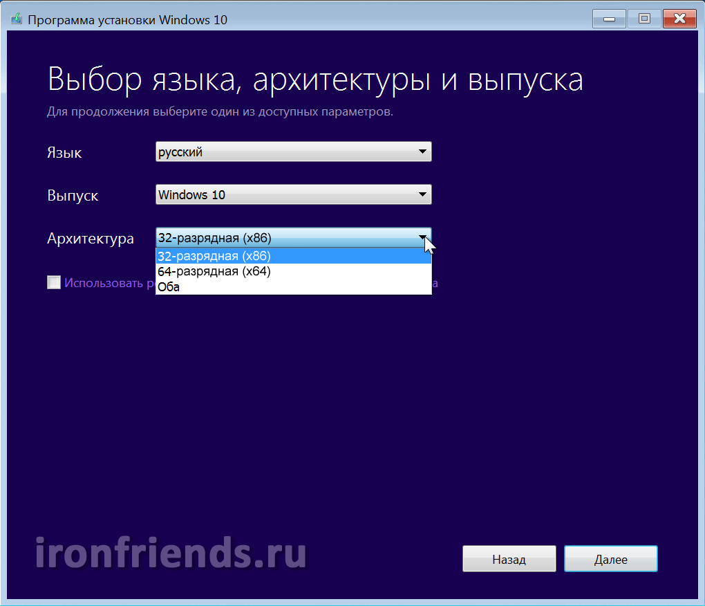 Далее вы увидите окно, в котором нужно будет сделать выбор языка, архитектуры и выпуска Windows 10.