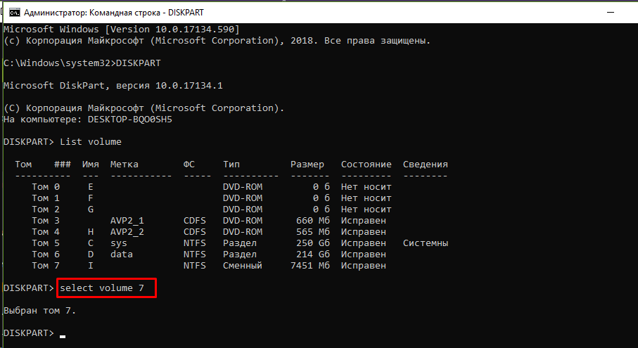 Нужный нам том под номером семь. Теперь его необходимо выбрать с помощью команды select volume (номер тома у меня 7, вы ставите свой):