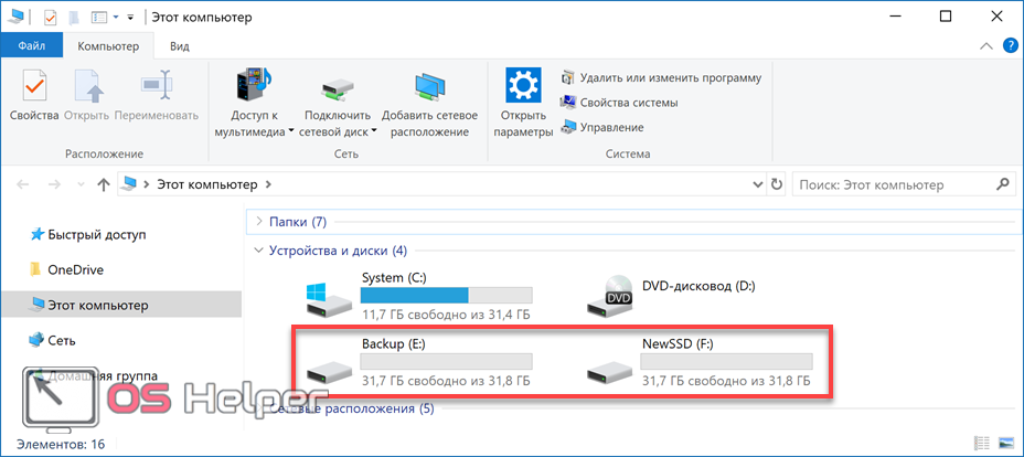Аналогичную операцию выполняем с новым ССД, присваивая ему имя «NewSSD». Открыв «Проводник» убеждаемся, что все они видны из-под ОС.