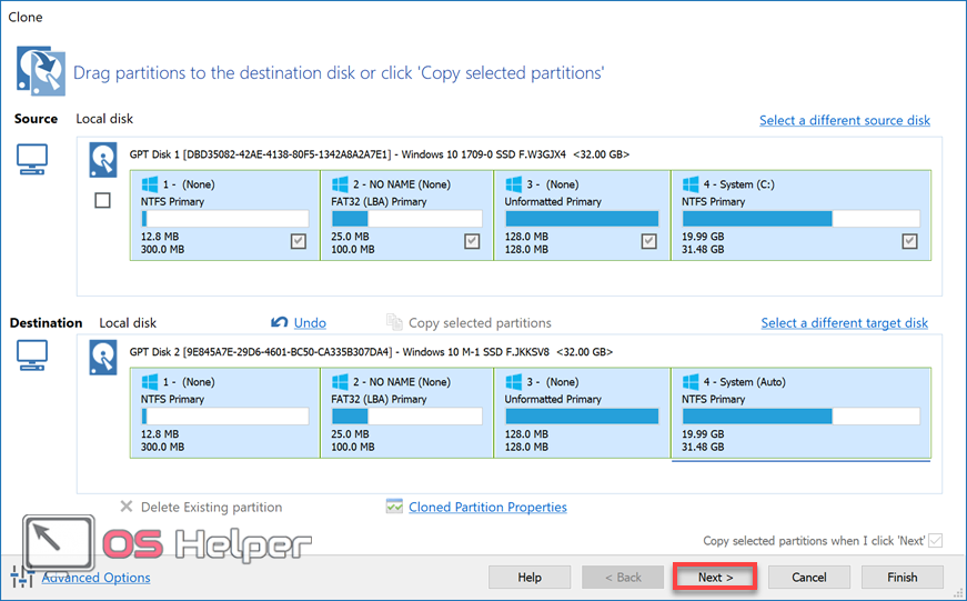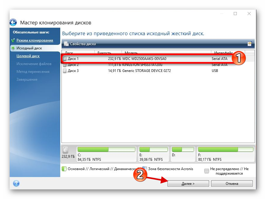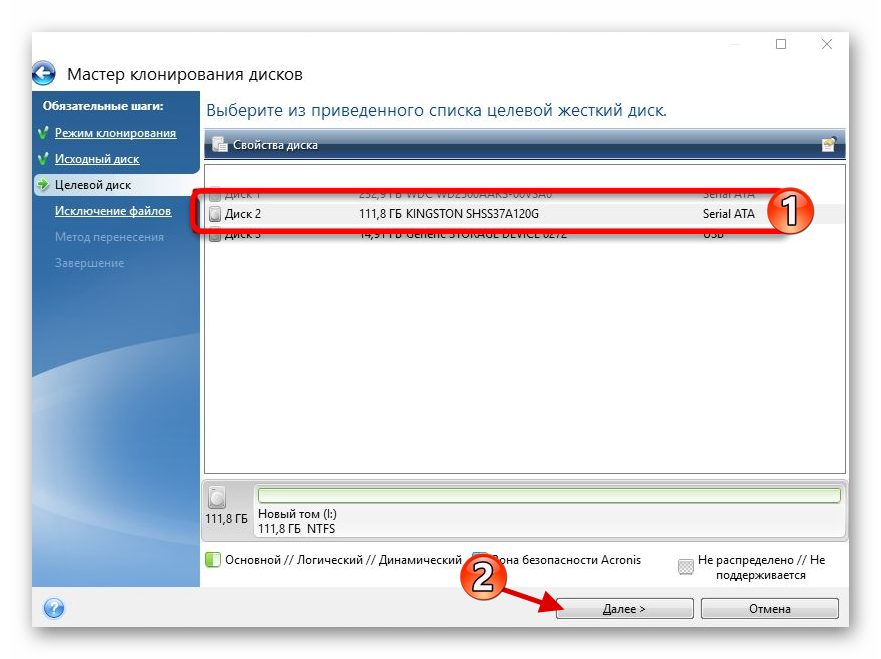 Теперь отметьте твердотельный накопитель, чтобы программа смогла перенести на него данные.