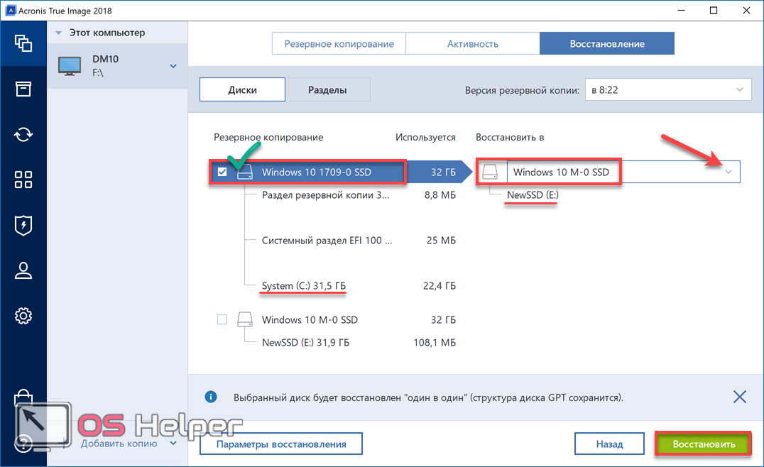 - Отмечаем галочкой источник – резервную копию текущего диска. В выпадающем меню выбираем диск-получатель – новый SSD. Запускаем процесс переноса.