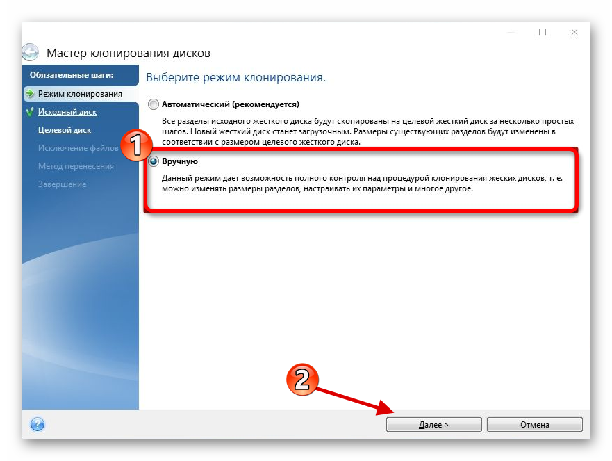 - Режим «Вручную» позволяет сделать всё самостоятельно. То есть вы можете перенести на новый SSD только ОС, а остальные объекты оставить на старом месте.