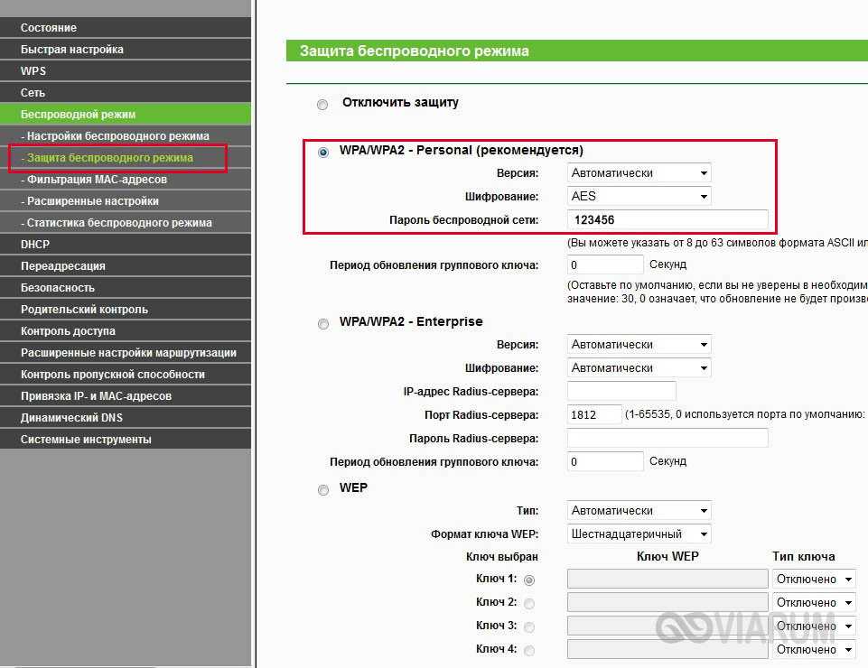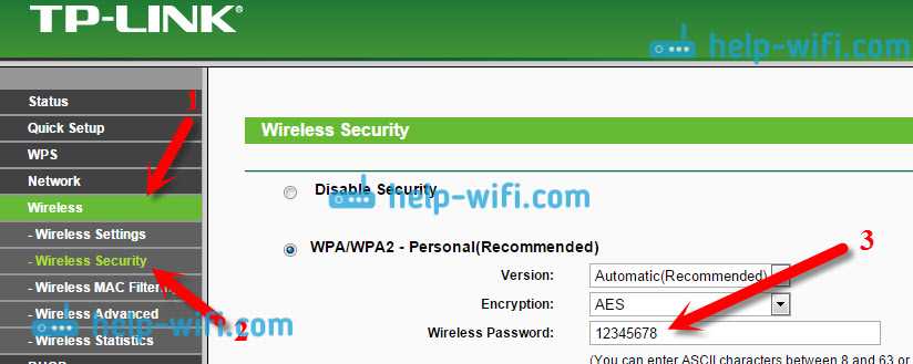 Если подключен TP-Link, то последовательность действий будет: «Беспроводной режим» – «Безопасность беспроводного режима» – «WPA/WPA2 – Personal» – «Пароль беспроводной сети».