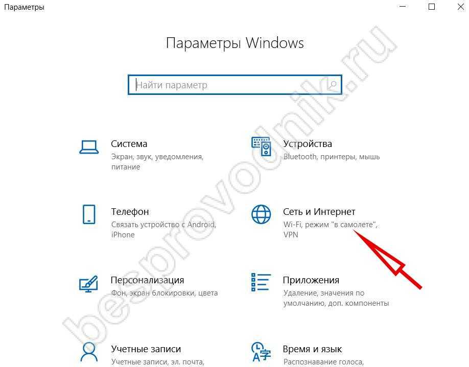 Открыть «Параметры» — раздел, который в более ранних версиях системы назывался «Панель управления» — и выбрать такой пункт, как «Интернет».